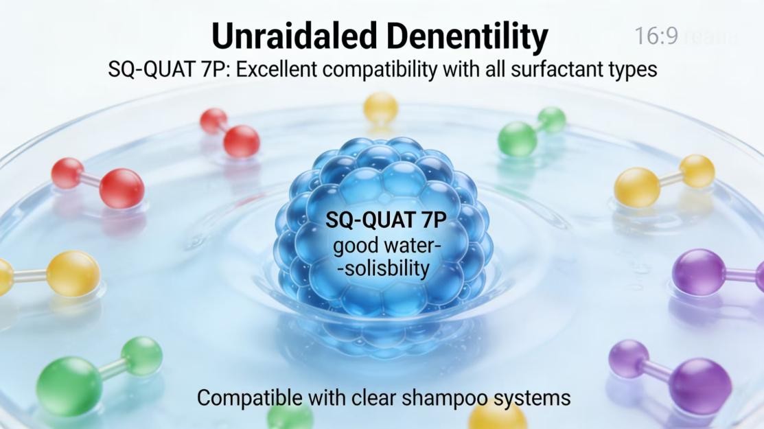 В сложных системах шампуней «гармоничное сосуществование» ингредиентов является ключом к успеху рецептуры. SQ-QUAT 7P обладает хорошей растворимостью в воде и хорошо совместим с анионными, катионными, неионными и амфотерными поверхностно-активными веществами. Это дает разработчикам рецептур большую гибкость, позволяя легко включать его в любую систему (будь то прозрачная или перламутровая эмульсия), не беспокоясь о потере стабильности или эффективности, обеспечивая стабильную текстуру и превосходные характеристики конечного продукта.